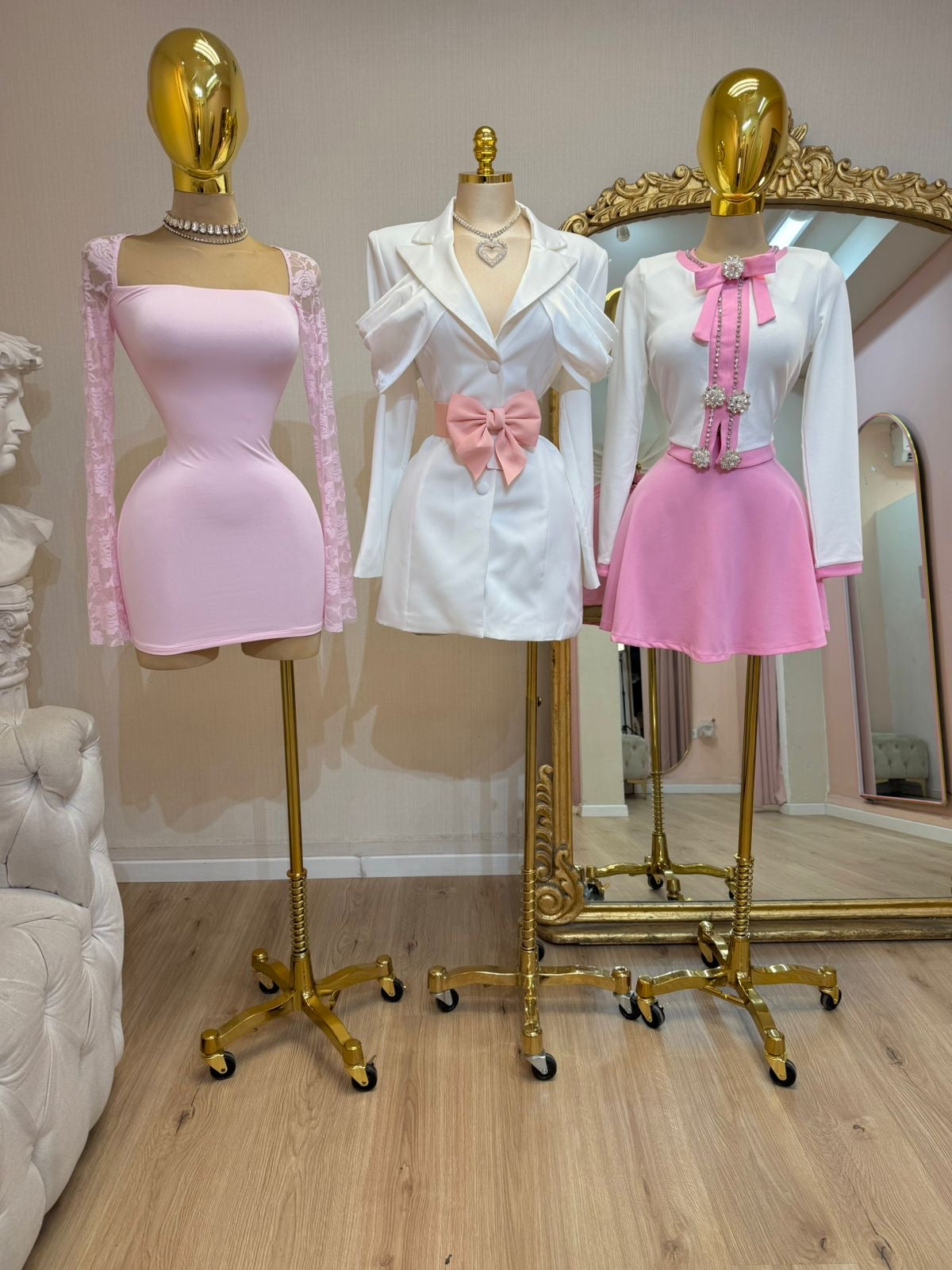 SET ROSA BLUSA BLANCA MOÑO CRISTALES