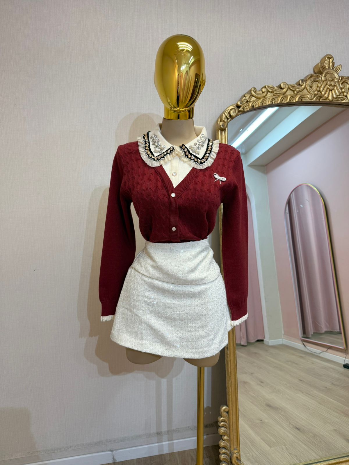 SUÉTER VINO CUELLO HUESO CRISTALES/PERLAS