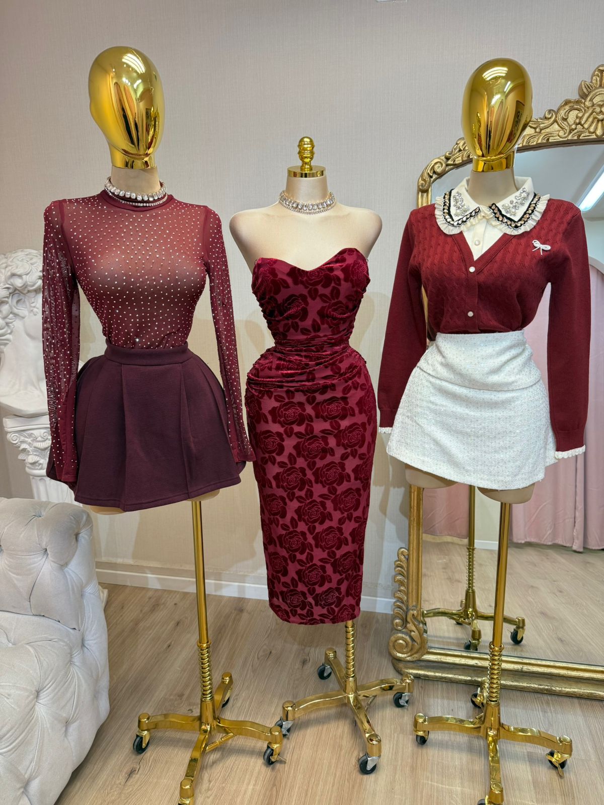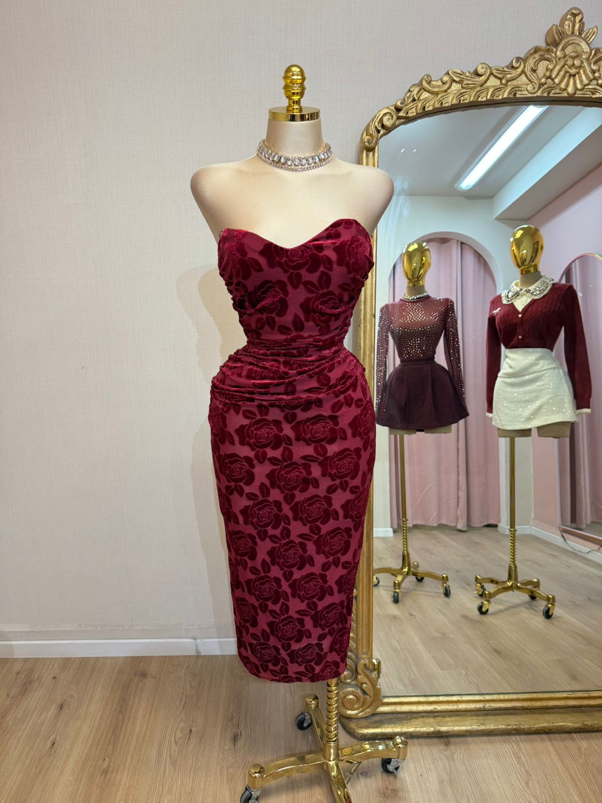 VESTIDO ROJO FLORES GAMUZA STRAPLE