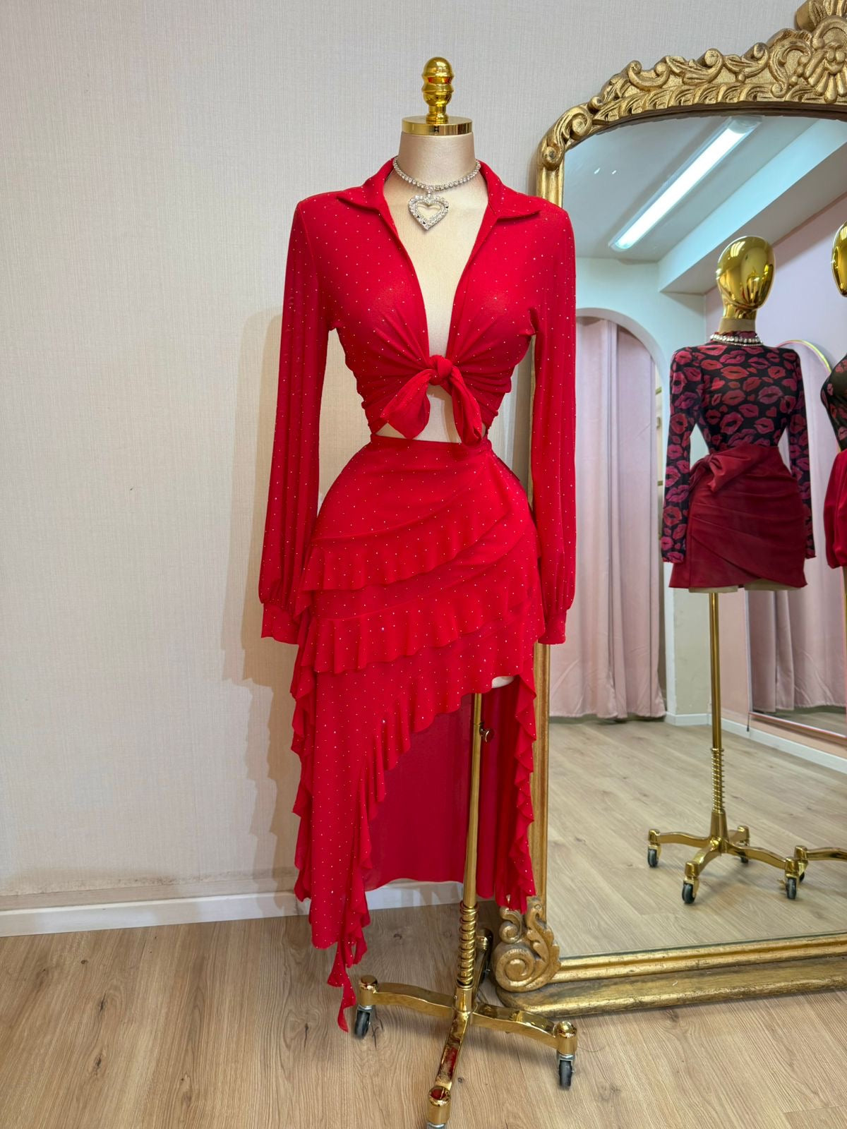 SET ROJO MESH CRISTALES RUFFLES