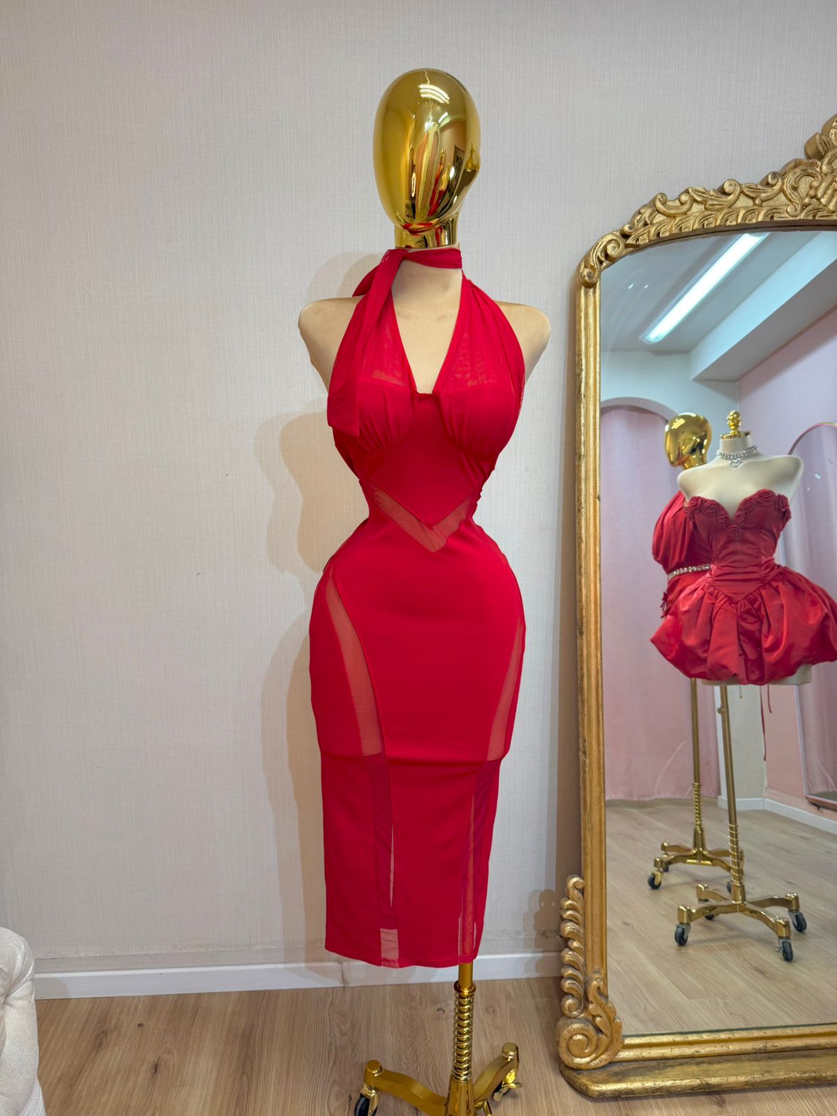 VESTIDO ROJO LÍNEAS TRANSPARENTES CUELLO